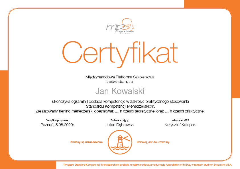 - Do potwierdzenia, że menedżer nie tylko ukończył proces szkolenia, ale nabył kompetencje.